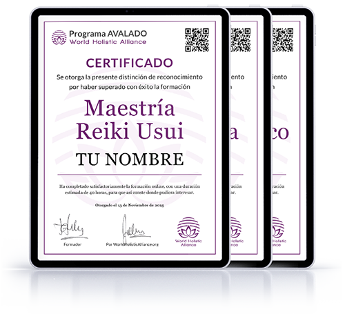 Cada formación está avalada por World Holistic Alliance (WHA), e incluye su propio certificado digital personalizado, que podrás descargar e incorporar a tu currículum profesional o usar para ofrecer tus propias sesiones.
